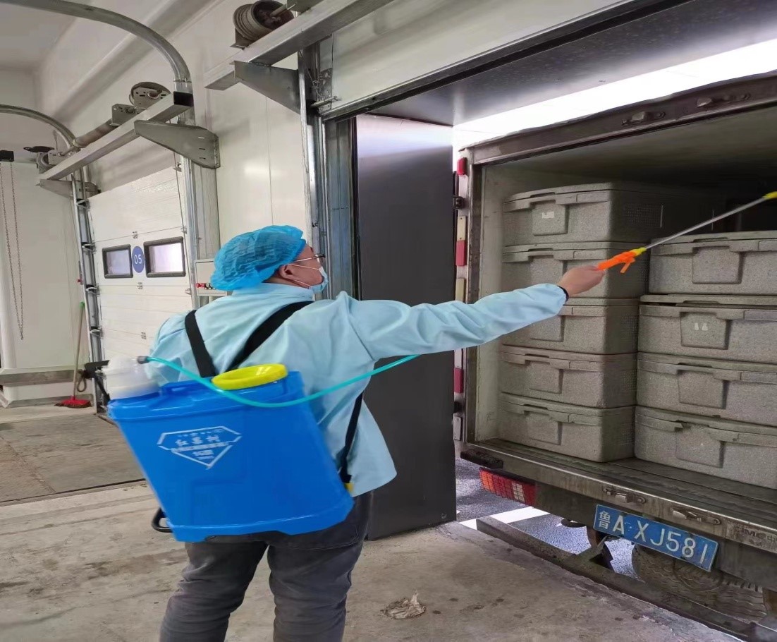 為保證食品安全和員工自身安全,金德利團(tuán)餐公司、供應(yīng)鏈公司每天都堅持消毒環(huán)節(jié)的打卡監(jiān)督管理。進(jìn)入公司園區(qū)的車輛嚴(yán)格進(jìn)行消殺,大噴霧器對進(jìn)出車輛進(jìn)行消殺、登記;對接車間具體負(fù)責(zé)人安排專人對食品箱進(jìn)行消殺。