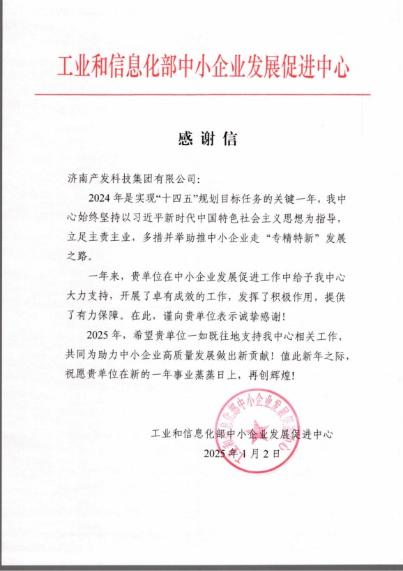 近日,濟南產發科技集團有限公司(以下簡稱“科技集團”)收到一封來自工業和信息化部中小企業發展促進中心(以下簡稱“促進中心”)的感謝信,信中對科技集團在2024年中小企業發展促進工作中發揮積極作用、提供有力保障表示由衷感謝。